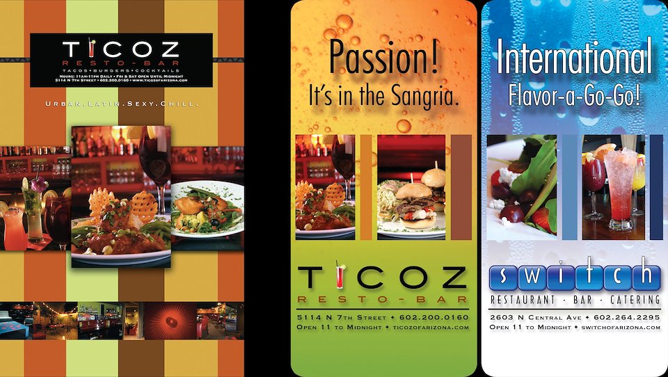 Ticoz & Switch Print Advertisements. Client: Ticoz Resto-Bar & Switch Restaurant & Wine Bar, Phoenix, AZ.