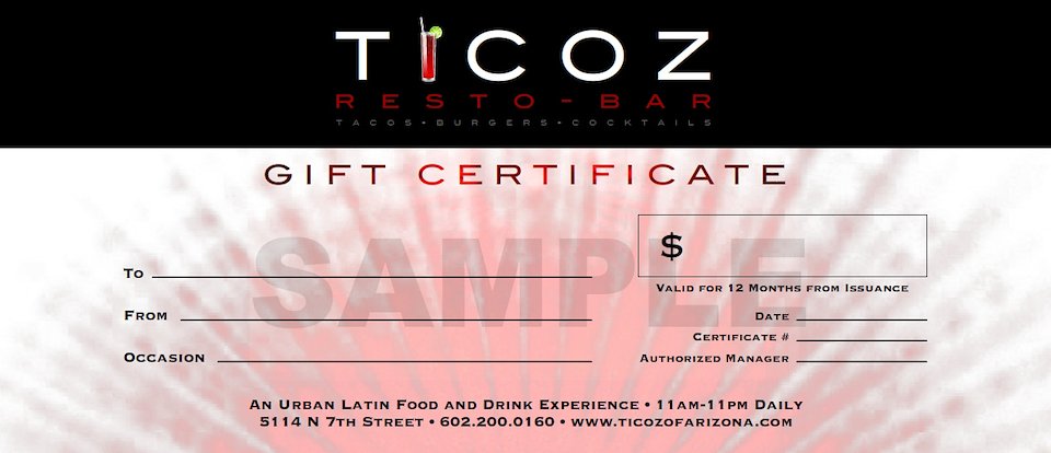 Ticoz Resto-Bar Gift Certificate. Client: Ticoz Resto-Bar, Phoenix, AZ.