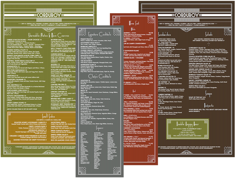 Corduroy Menu Designs. Client: Corduroy, Phoenix, AZ.