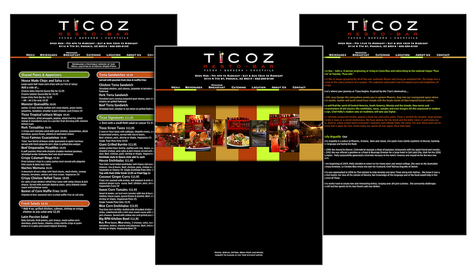 Ticoz Resto-Bar Web Design. Client: Ticoz Resto-Bar, Phoenix, AZ.