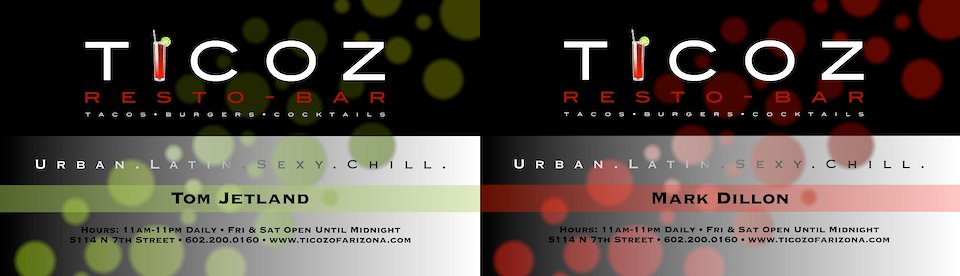 Ticoz Resto-Bar Business Cards. Client: Ticoz Resto-Bar, Phoenix, AZ.